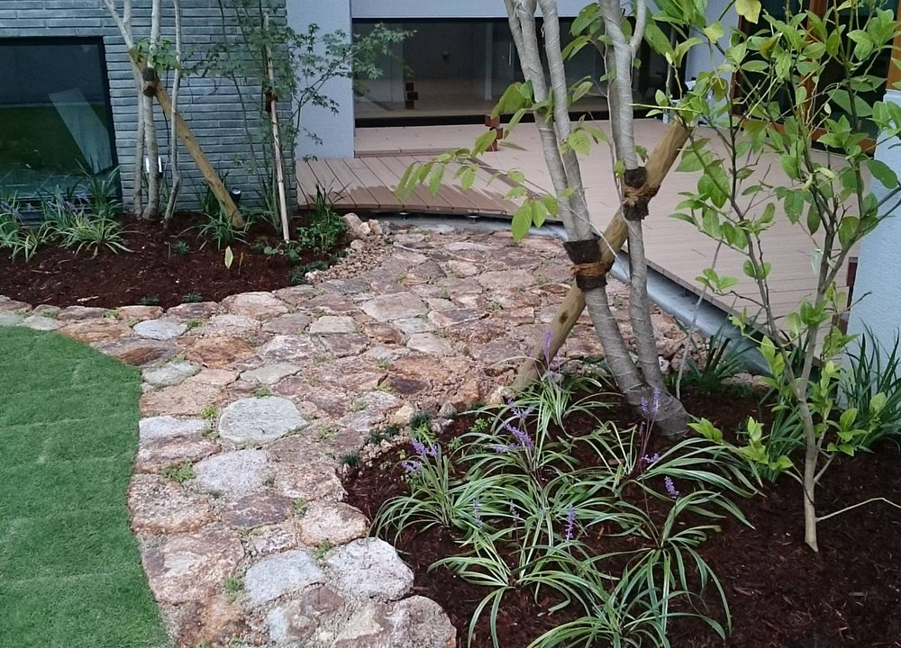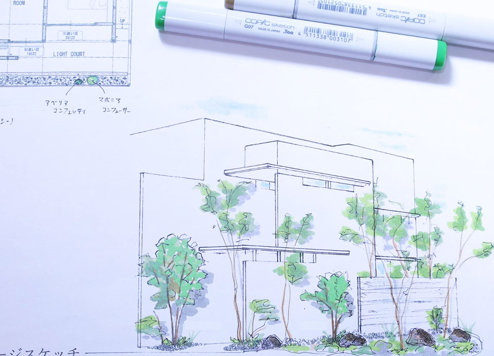 外構デザインにつきましても、建築とのバランスを大切に、近年の風潮にも造園技術を織り込素材を厳選した、使い勝手の良い、お客様立場のプランを提案させていただきます。
